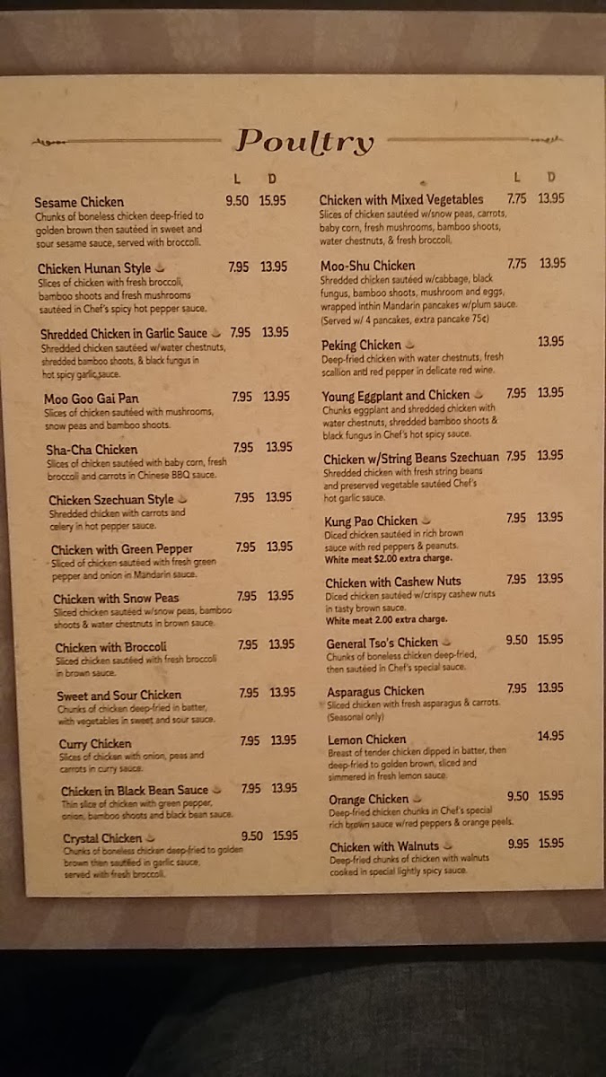 Dinner and Chef's Specials present a range of protein-centered dishes such as Sesame Chicken, Hot and Sour Soup, Orange Chicken Lunch, Cashew Chicken, Shredded Pork in Garlic Sauce, Yu Ling Duck with Bone (crispy duck with house special sauce and steam rice), Beef Kung Pao, Beef Hunan Style, and Peking Chicken. Additional options include seafood plates like Scallops and Beef with Snow Peas, and specialty items such as the Pu Pu Platter for two and Chicken Wings. These selections cater to diners seeking a more substantial meal.
