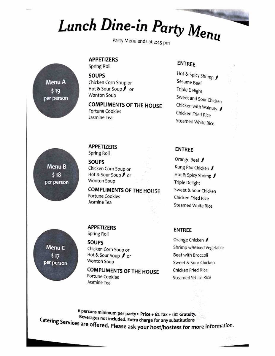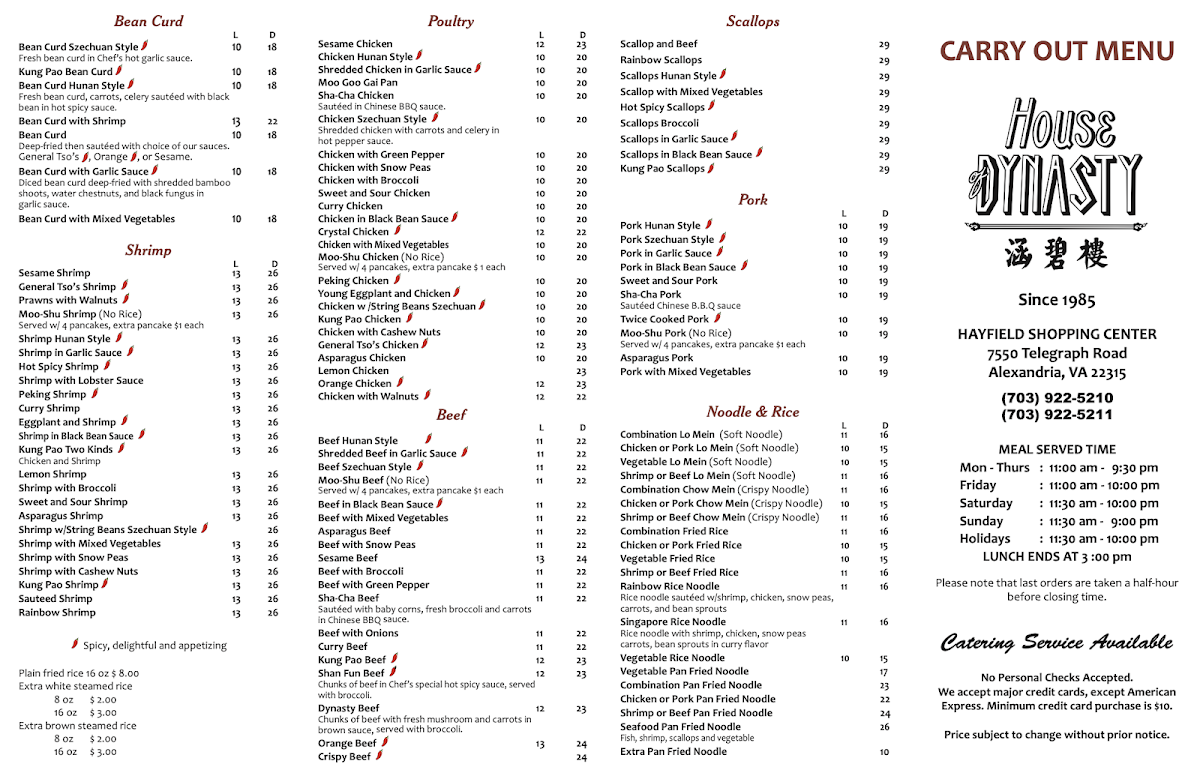 The menu at House of Dynasty offers a variety of authentic Chinese dishes organized across several categories to accommodate different meal preferences. Visitors can explore options suitable for lunch and dinner, featuring appetizers, lunch entrees, main courses, and chef's specials.