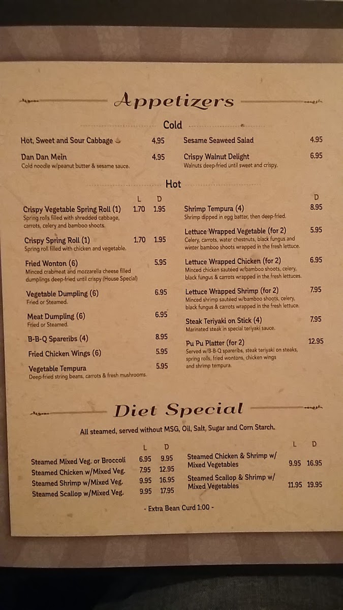 Appetizers include selections such as Dan Dan Mein cold noodles with peanut butter and sesame sauce, veggie or chicken spring rolls, vegetable tempura, steak teriyaki on sticks, and vegetable lettuce wraps. These items provide light bites to start a meal or enjoy as a casual snack.