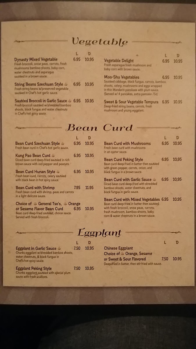 Lunch Entrees focus on vegetable-based dishes served with fried rice, including Vegetable Delight with fresh asparagus, mushroom, and baby corn, Dynasty Mixed Vegetables with an assortment of fresh vegetables sautéed in brown sauce, and Sweet & Sour Eggplant. Lunch offerings provide balanced options suitable for midday dining.